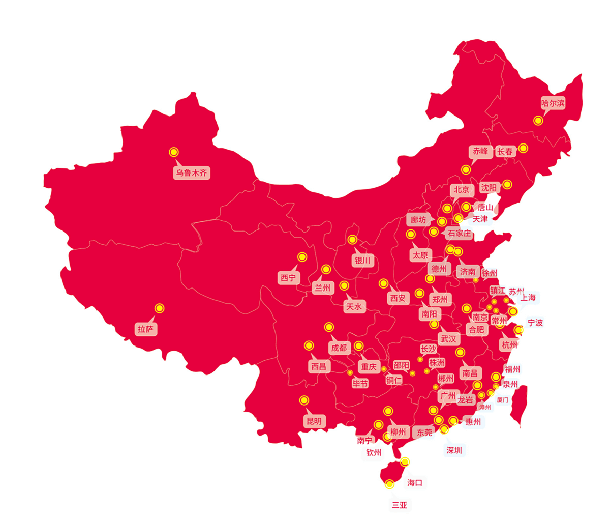深圳、厦门、武汉、兰州、三亚、南宁、东莞、沈阳、杭州、株洲、铜仁、重庆、常州、西昌、西安、德州、哈尔滨、南京、长春、石家庄、赤峰、上海、苏州、廊坊、昆明、宁波、漳州、南阳、毕节、邵阳、钦州、泉州、广州、天津、惠州、济南、临沂、贵阳、唐山、郴州、黔东南、龙岩、安阳、郑州、宁德、广州东区、潍坊、柳州、北京、邯郸、宜昌、黔南洲、徐州、烟台、佛山、太原、池州、海口、怀化、拉萨、娄底、黔西南、宿州、无锡、新乡、银川、遵义、安顺、南昌、包头、景德镇、河源、丽水、珠海、成都、泰安。
